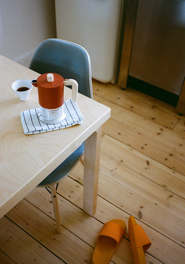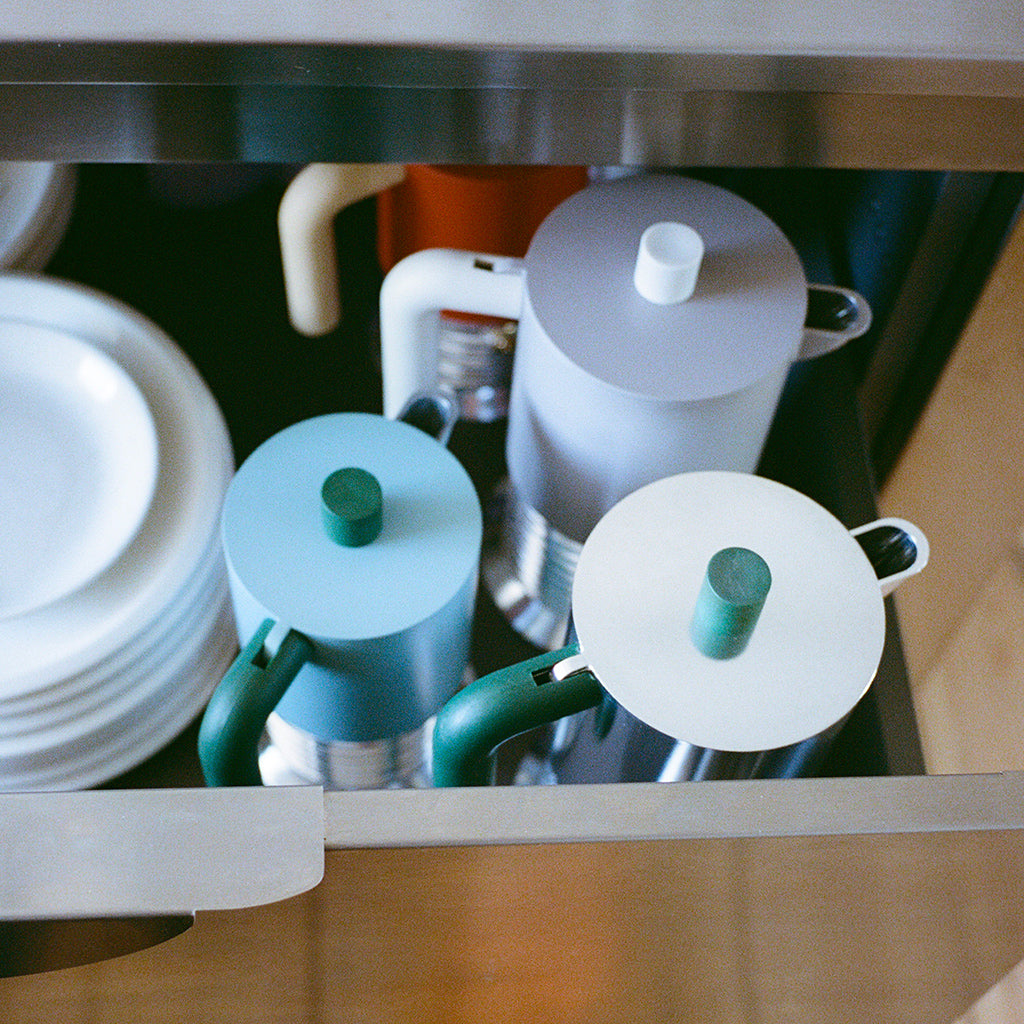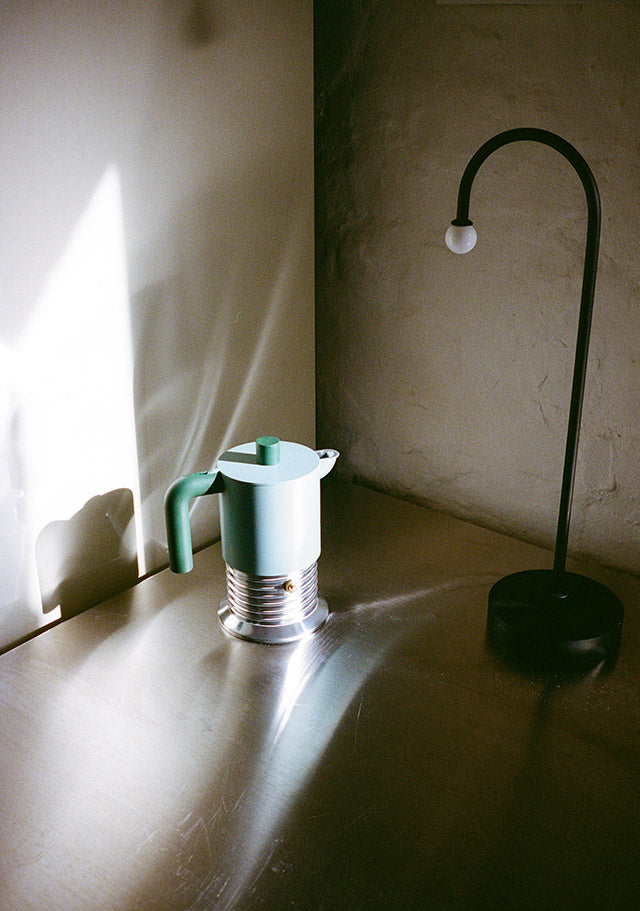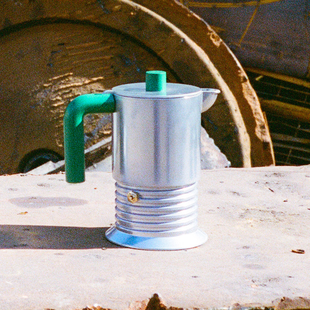 La cafetière espresso Vite est une petite sculpture industrielle. La chaudière évoque la forme d’une vis (« vite » en italien), une référence directe au geste d’utilisation. L’aluminium naturel renforce cette référence et confère à l’espresso un goût rond et corsé.