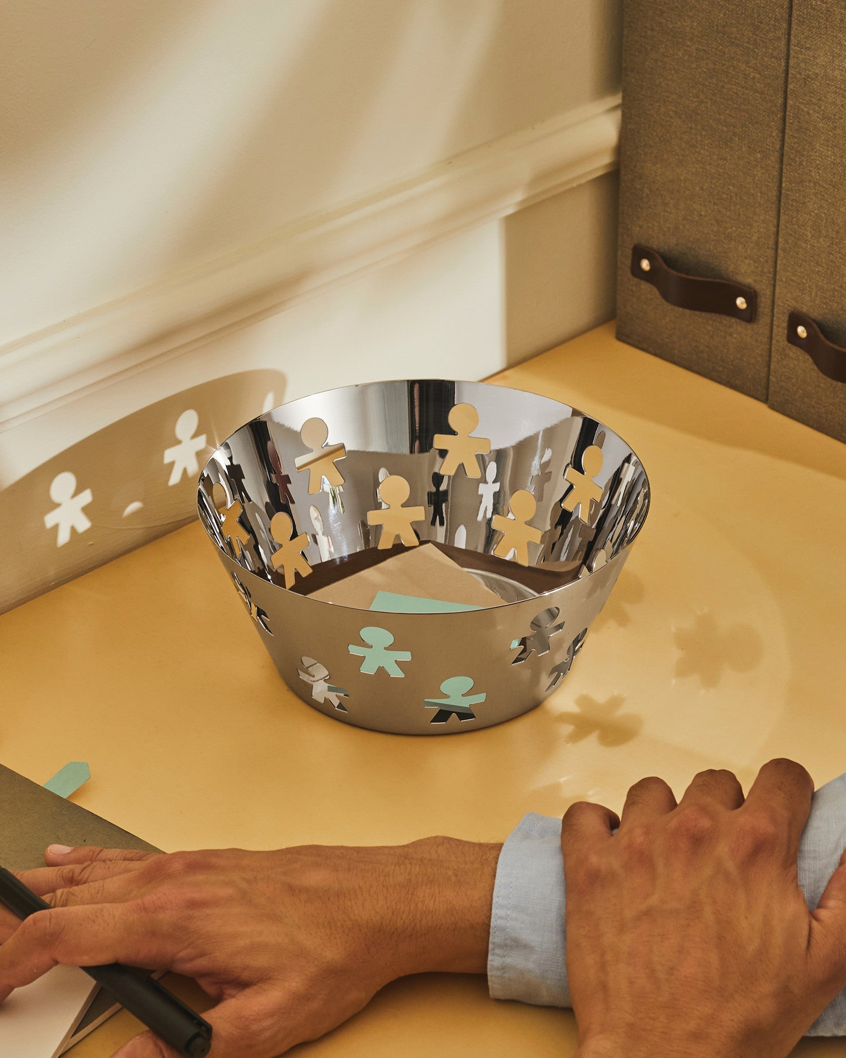 Symbole du design ludique basé sur l'utilisation de codes affectifs - excellent exemple d'enracinement dans les souvenirs d'enfance - le motif des petits bonshommes a fait ses débuts sur le produit peut-être le plus traditionnel d'Alessi, le plateau, avant de s'étendre au catalogue. Le choix du design perforé a été très disputé : parmi une multitude de profils anthropomorphes possibles, la forme finale s'est imposée, notamment grâce aux conseils involontaires du papetier personnel de Giovannoni qui, confronté à trois alternatives, a clairement suggéré celle qui allait devenir le bonhomme iconique.